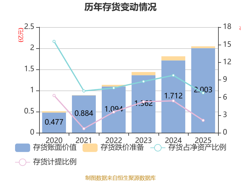 从存货变动来看,截至2025年末,公司存货账面价值为2亿元,占净资产的6.78%,较上年末增加2913.69万元。其中,存货跌价准备为432.34万元,计提比例为2.11%。