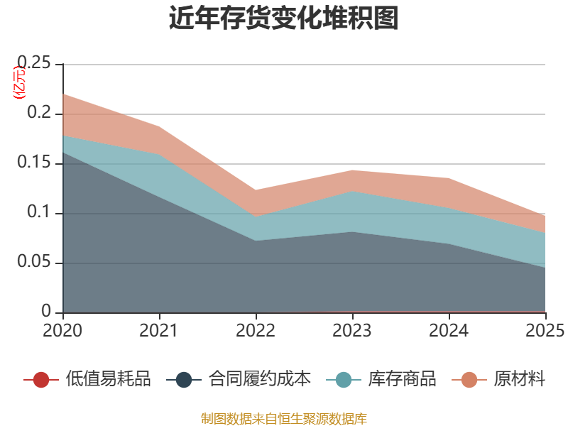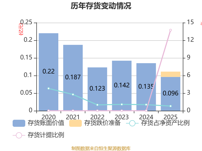 从存货变动来看,截至2025年末,公司存货账面价值为963.85万元,占净资产的0.79%,较上年末减少388.5万元。其中,存货跌价准备为153.36万元,计提比例为13.73%。