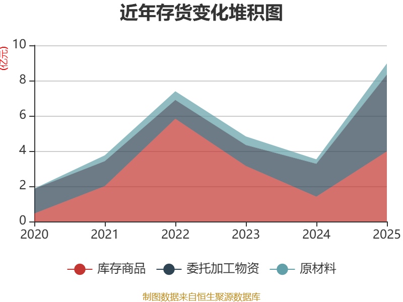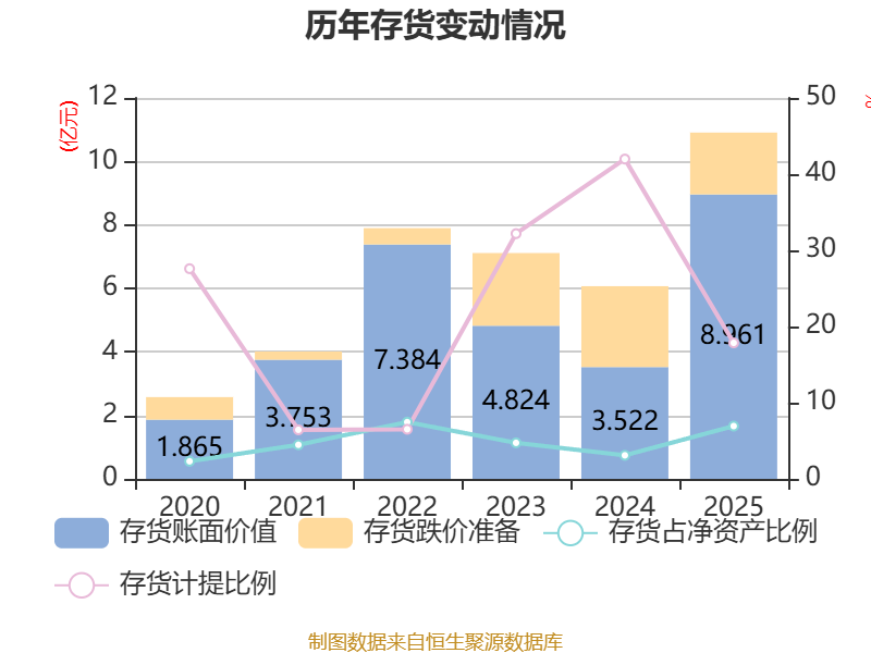 从存货变动来看,截至2025年末,公司存货账面价值为8.96亿元,占净资产的6.93%,较上年末增加5.44亿元。其中,存货跌价准备为1.95亿元,计提比例为17.85%。