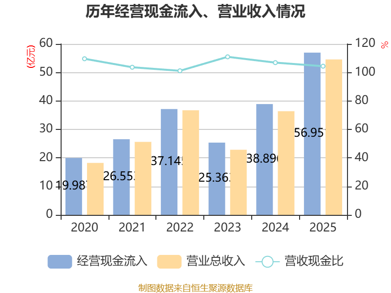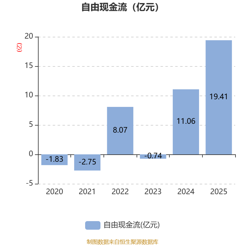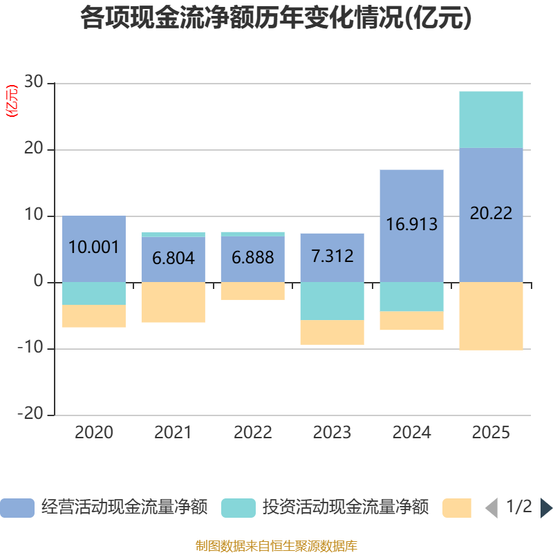 截至2025年,公司经营活动现金流净额为20.22亿元,同比增长19.55%;筹资活动现金流净额-10.29亿元,同比减少7.52亿元;投资活动现金流净额8.5亿元,上年同期为-4.43亿元。