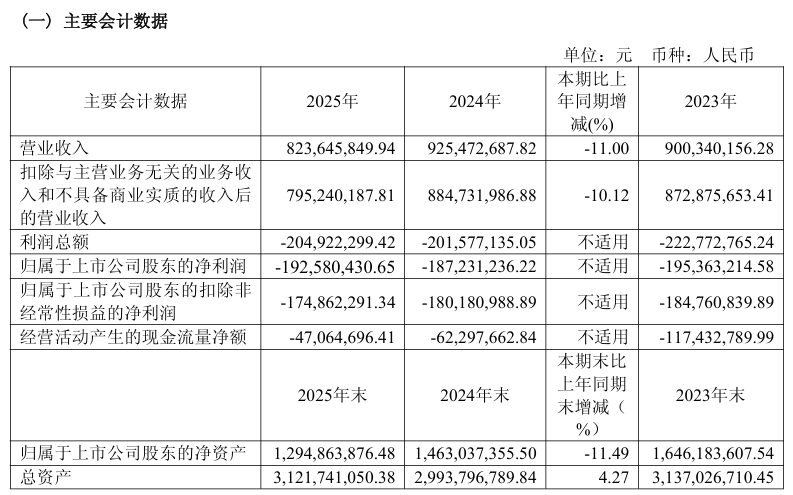 2025年利润总额-2.05亿元,归属于上市公司股东的净利润-1.93亿元,较2024年的-1.87亿元亏损增加2.86%。扣除非经常性损益后的净利润-1.75亿元,较2024年的-1.80亿元亏损略有收窄。基本每股收益-0.30元/股。