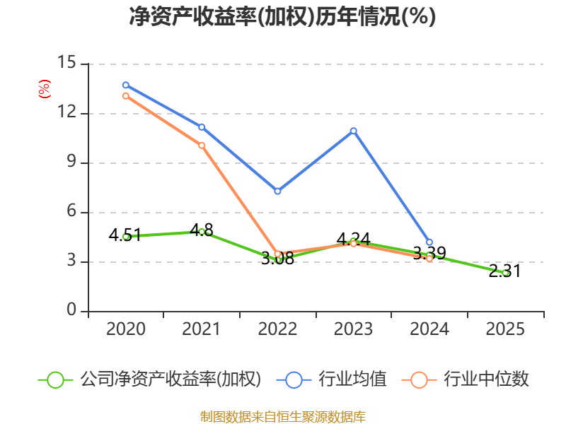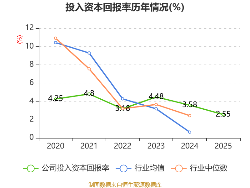 数据显示,2025年公司加权平均净资产收益率为2.31%,较上年同期下降1.08个百分点。公司2025年投入资本回报率为2.55%,较上年同期下降1.03个百分点。