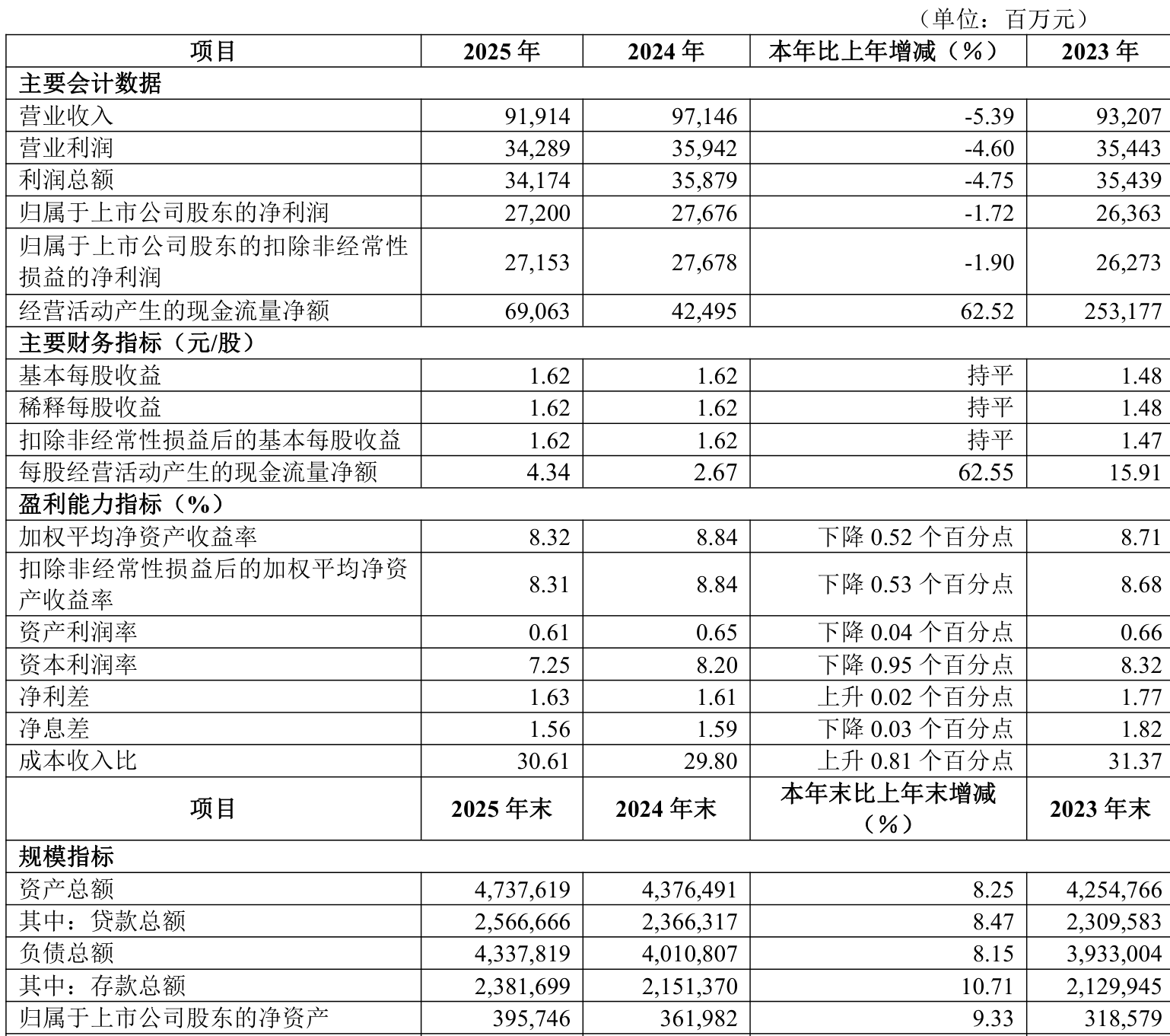 中证智能财讯华夏银行(600015)3月31日披露2025年年度报告。2025年,公司实现营业总收入919.14亿元,同比下降5.39%;归母净利润272亿元,同比下降1.72%;扣非净利润271.53亿元,同比下降1.90%;经营活动产生的现金流量净额为690.63亿元,同比增长62.52%;报告期内,华夏银行基本每股收益为1.62元,加权平均净资产收益率为8.32%。公司2025年度分配预案为:拟向全体股东每10股派现3.2元(含税)。