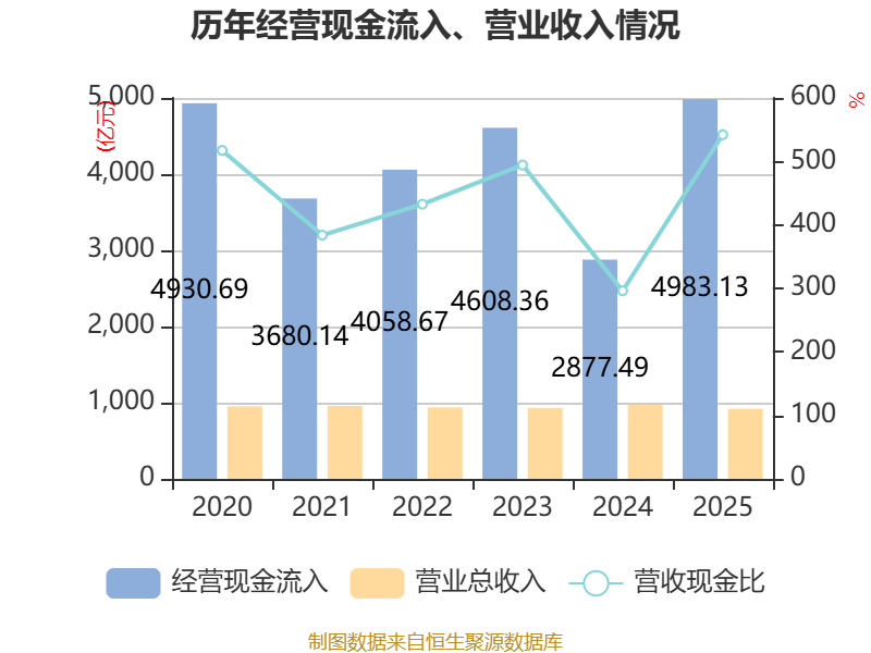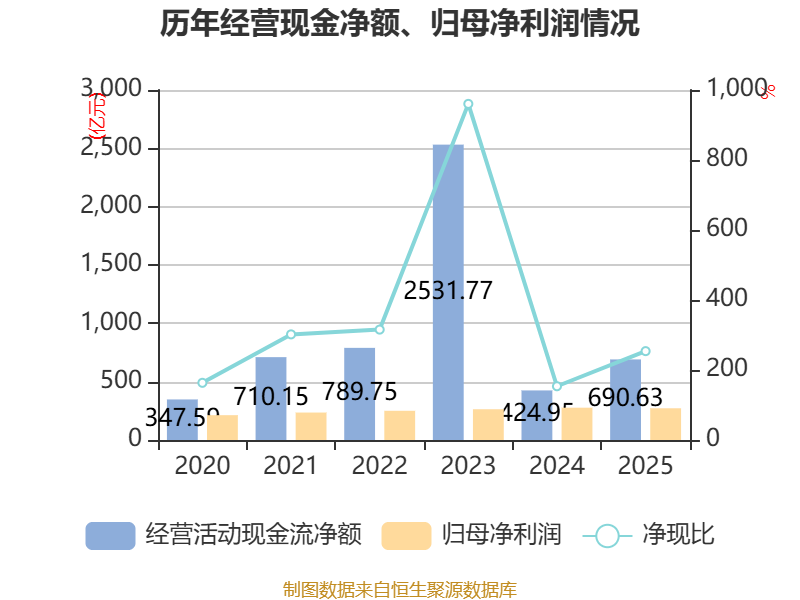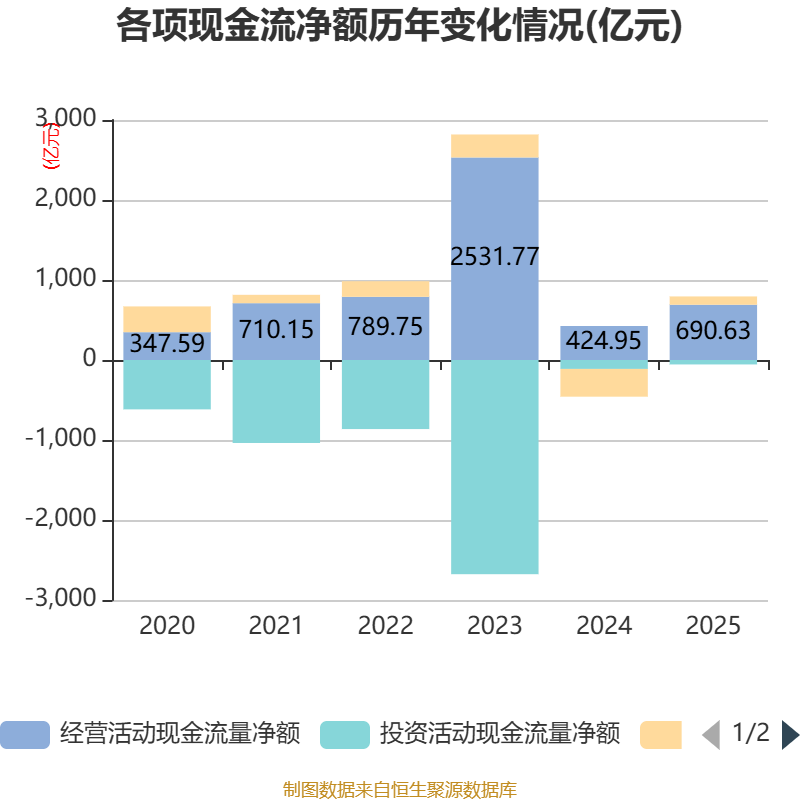 截至2025年,公司经营活动现金流净额为690.63亿元,同比增长62.52%;筹资活动现金流净额104.15亿元,同比增加451.22亿元;投资活动现金流净额-55.51亿元,上年同期为-111.64亿元。