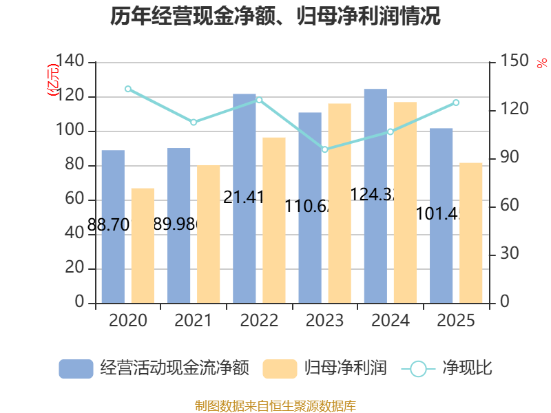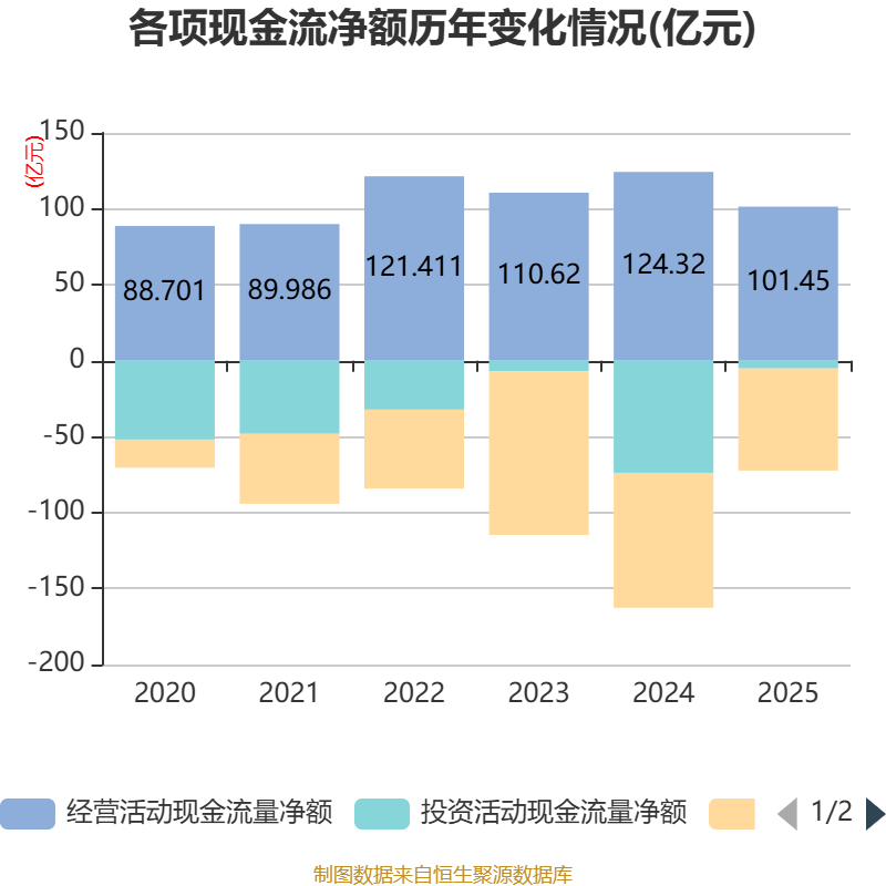 截至2025年,公司经营活动现金流净额为101.45亿元,同比下降18.4%;筹资活动现金流净额-67.24亿元,同比增加21.58亿元;投资活动现金流净额-5.09亿元,上年同期为-73.83亿元。