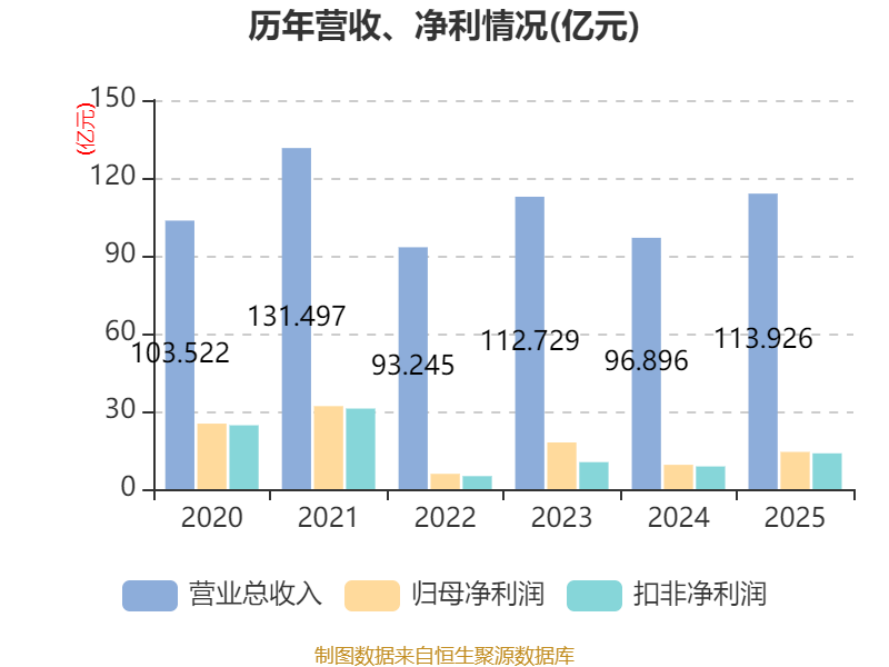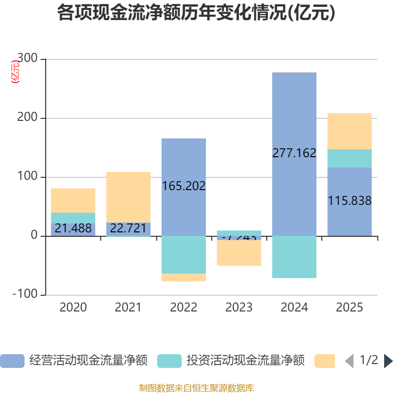截至2025年,公司经营活动现金流净额为115.84亿元,同比下降58.21%;筹资活动现金流净额61.13亿元,同比增加60.41亿元;投资活动现金流净额30.94亿元,上年同期为-71.75亿元。