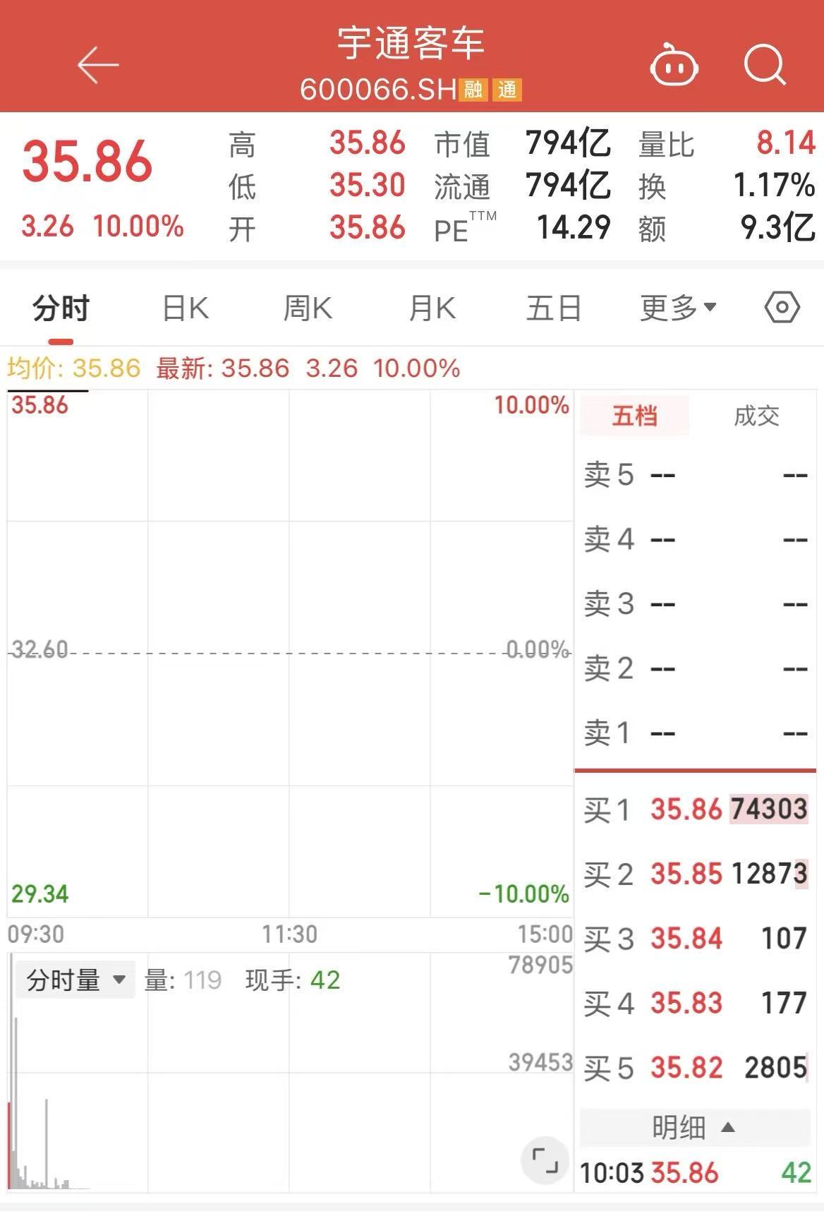 3月31日开盘,A股客车龙头宇通客车(600066.SH)一字涨停,股价再创历史新高,市值近800亿元,截至10:02分,报35.86元/股,封板资金超2亿元。