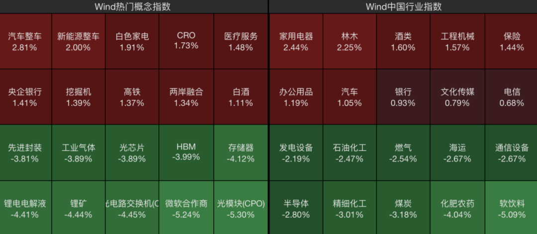 从板块上看,创新药概念股活跃,银行板块盘中拉升,白酒、家电、汽车板块表现活跃;CPO、化工、煤炭、半导体等板块跌幅居前。下跌个股超3600只。