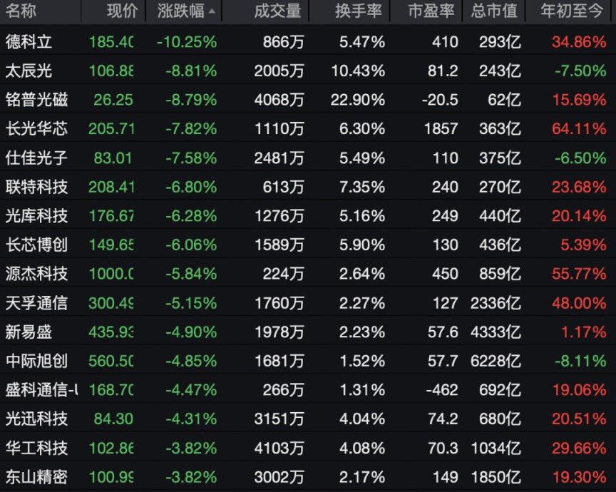 CPO概念股集体走低,德科立跌超10%,太辰光、铭普光磁、长光华芯等跌幅居前。