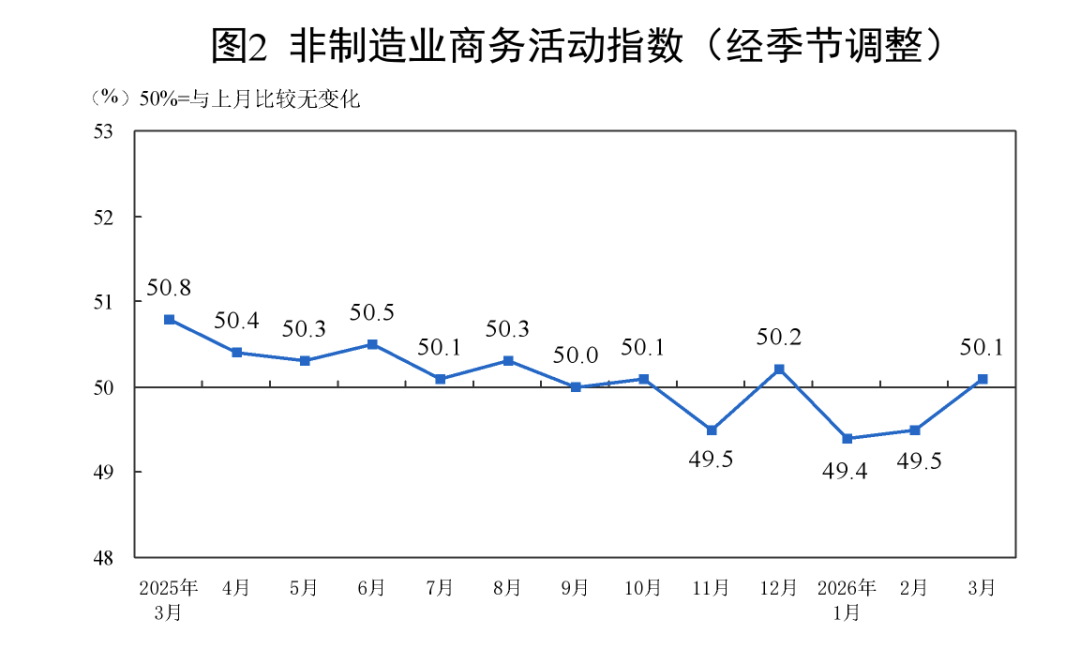 数据显示,3月份,非制造业商务活动指数为50.1%,比上月上升0.6个百分点,高于临界点,非制造业景气水平有所改善。