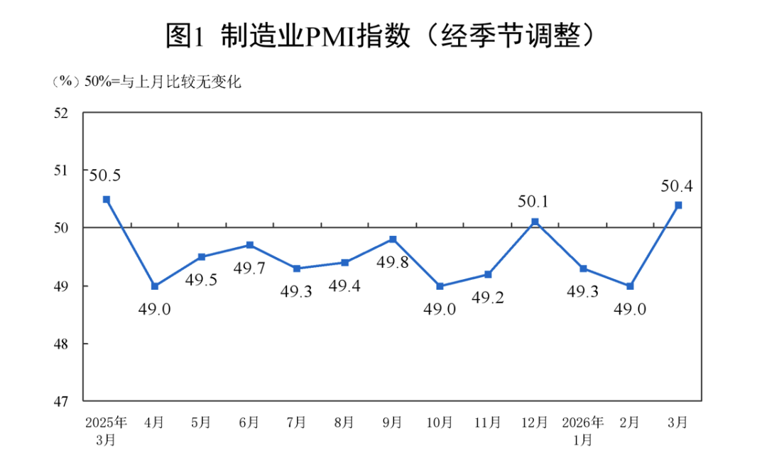 国家统计局3月31日发布的数据显示,3月份,制造业采购经理指数(PMI)、非制造业商务活动指数和综合PMI产出指数均重返扩张区间,分别为50.4%、50.1%和50.5%,比上月上升1.4个、0.6个和1.0个百分点,我国经济景气水平回升。