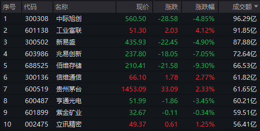 个股方面,中际旭创成交额超96亿元居首,工业富联、新易盛、兆易创新成交额靠前。