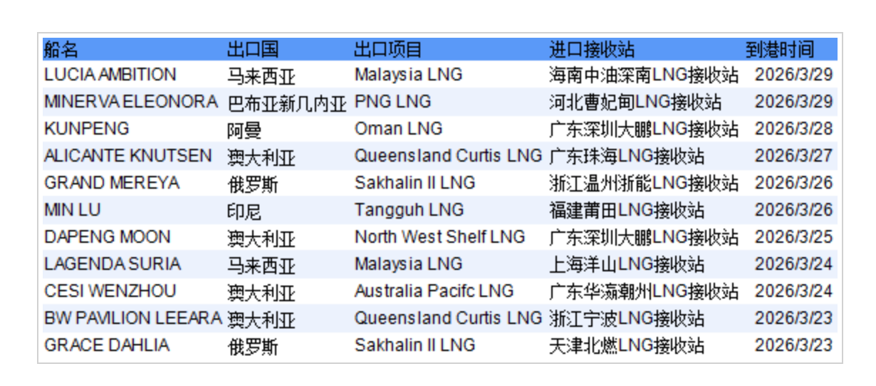 3月23日-3月29日中国LNG进口分析数据来源:中国天然气信息终端(E-Gas系统)