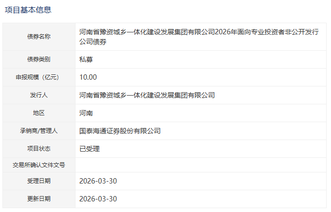 【大河财立方消息】3月31日消息,河南省豫资城乡一体化建设发展集团有限公司2026年面向专业投资者非公开发行公司债券项目获深交所受理。