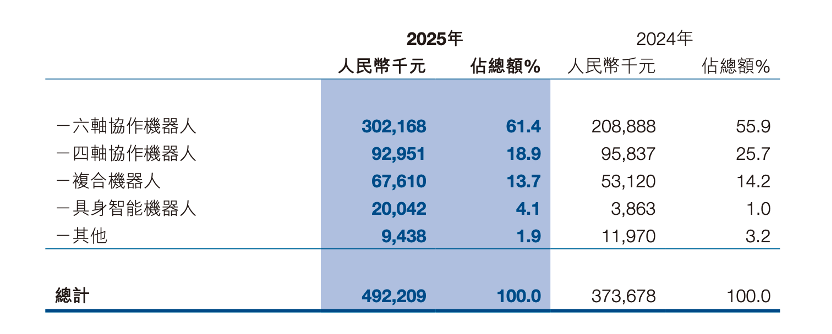 从营收结构来看,六轴协作机器人依然是越疆的营收基石,2025年收入达3.02亿元,同比增长44.66%,占总营收比重超过六成。四轴协作机器人收入为9295.1万元,占比18.9%。