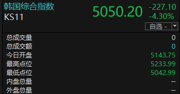 3月31日午后,韩国综合指数跌超4%,截至14:22,韩国综合指数跌4.3%,报5050.20点。