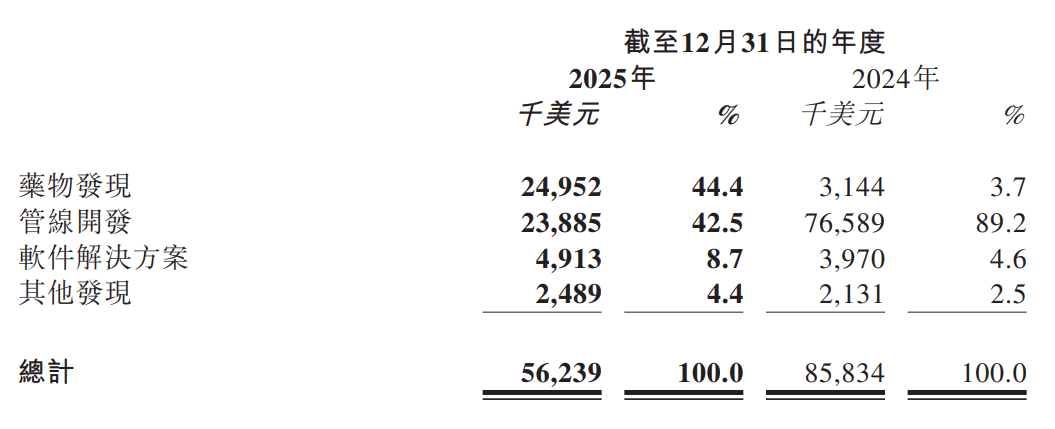 英矽智能的业务模式包括药物发现及管线开发、软件解决方案,以及其他与非医药领域相关的发现业务。2025年年报显示,报告期内药物发现业务收入2495.2万美元,占总营收比重达44.4%;管线开发业务收入2388.5万美元;软件解决方案业务收入491.3万美元;其他发现业务收入248.9万美元。
