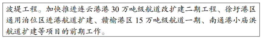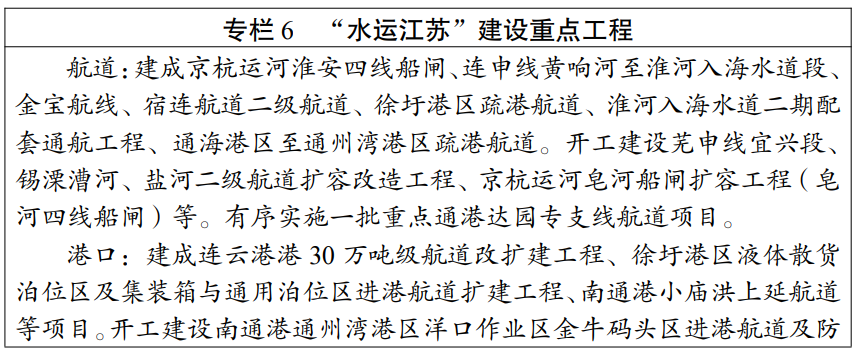 优化干支航道网络结构和航道标准,强化航道与港口、产业园区衔接。加强港口资源统筹和协同发展,加快建设连云港国际枢纽海港,持续提升港口发展能级,推动长江深水航道完善工程建设,鼓励航线布局与产业外向发展深度融合,拓展港航供应链服务。支持宿连航道等打造“电化运河”。