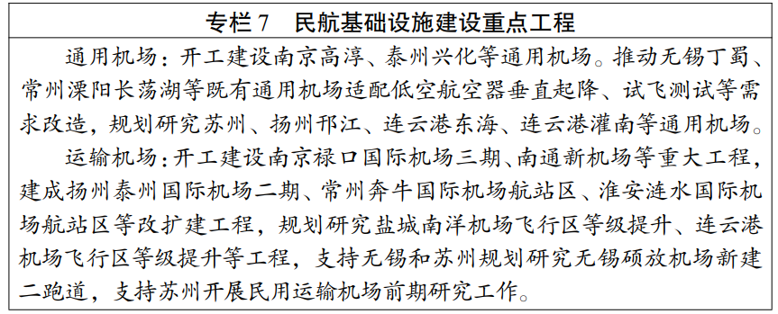 有序建设低空基础设施。统筹布局低空起降场(点),探索构建以南京和苏州为核心、其他设区市为节点的省级低空主干航路网络,稳妥有序推进有条件的城市划设低空公共航路。按需改造既有通用机场,推动建设作业服务型、物流配送型和文旅客运型起降场(点)。