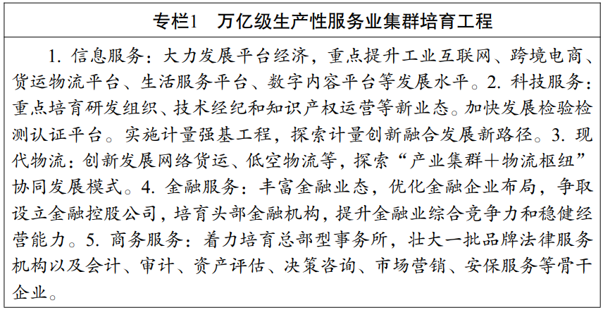 建强万亿级产业集群。坚持把服务业发展摆在重要战略位置,实施生产性服务业高质量发展行动,分领域推进生产性服务业向专业化和价值链高端延伸。加快提升信息服务、科技服务、现代物流、金融服务、商务服务等规模质效。