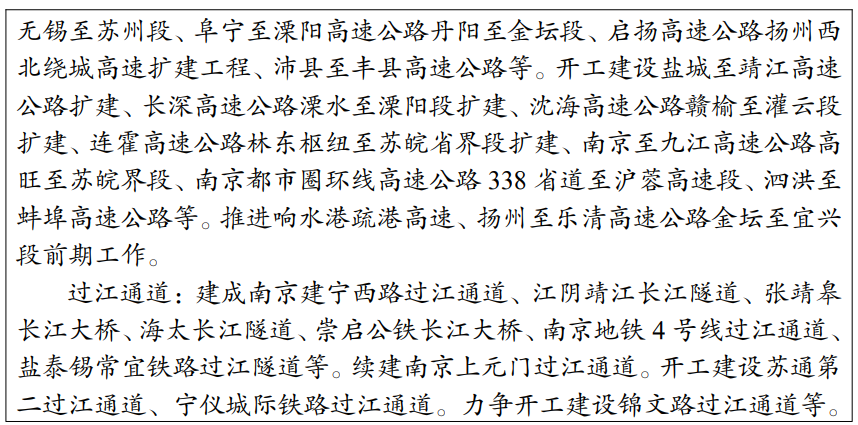 推进合宿铁路宿迁至泗县段、宁宣局部段、通苏嘉甬如东延伸段、扬镇宁马铁路镇江至马鞍山段、靖皋高铁连接线、新沂至淮安(含淮安东至黄楼段)等项目前期工作。