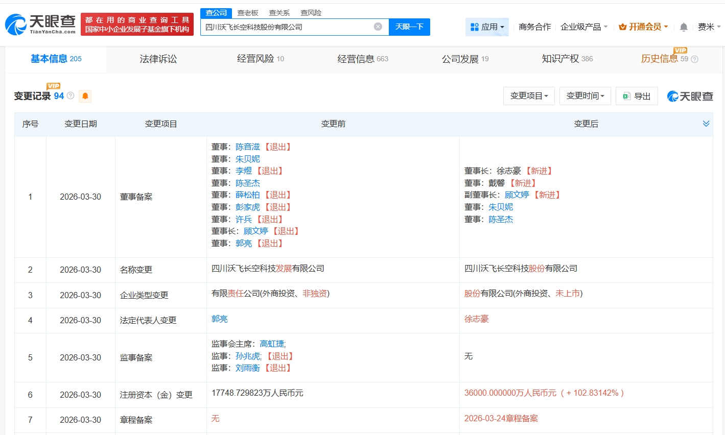 南方财经3月31日电,天眼查App显示,近日,四川沃飞长空科技发展有限公司发生工商变更,企业名称变更为四川沃飞长空科技股份有限公司,郭亮卸任法定代表人,顾文婷卸任董事长,徐志豪接任法定代表人、董事长,同时,注册资本由约1.77亿人民币增至3.6亿人民币,增幅约103%。该公司成立于2016年4月,经营范围包括智能机器人的研发、智能无人飞行器制造、智能无人飞行器销售等,由湖北吉利太力飞车有限公司、成都高新策源优产股权投资基金合伙企业(有限合伙)、杭州杭实低空产业私募基金合伙企业(有限合伙)等共同持股。
