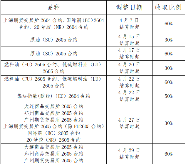 如实际调整日期或收取比例与上述不符,请以官网最新公告为准。各品种限仓细则请参见各交易所相关管理办法,或致电400-980-1818详询。