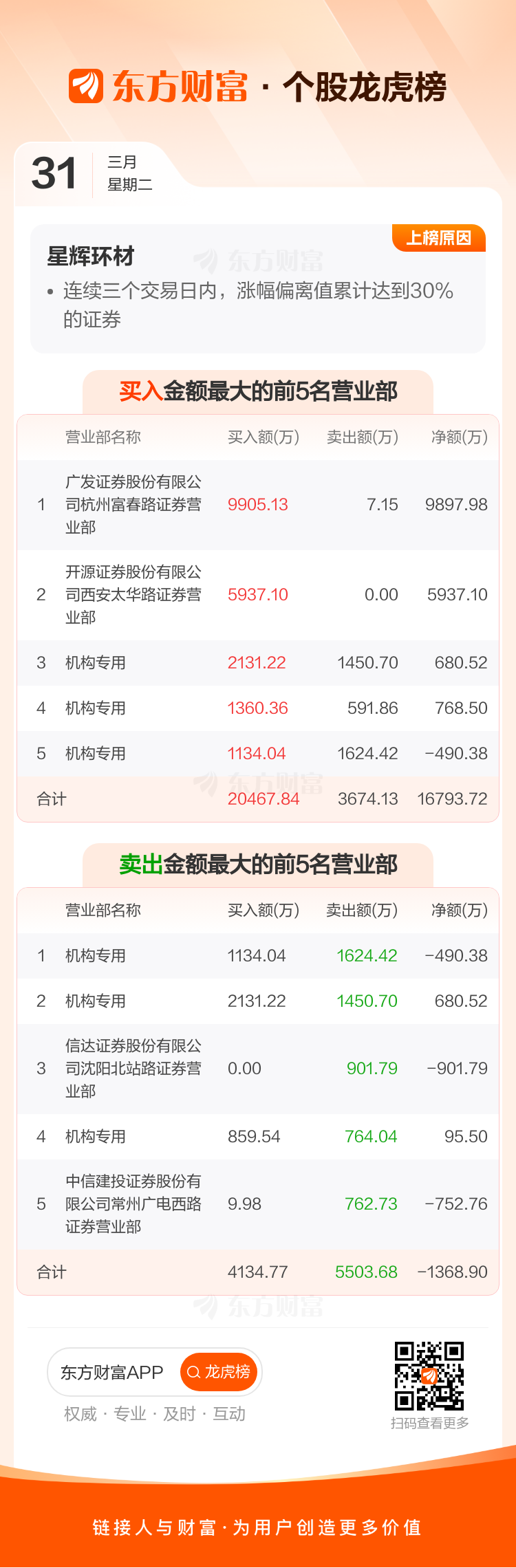 星辉环材(300834)龙虎榜数据(03-31)