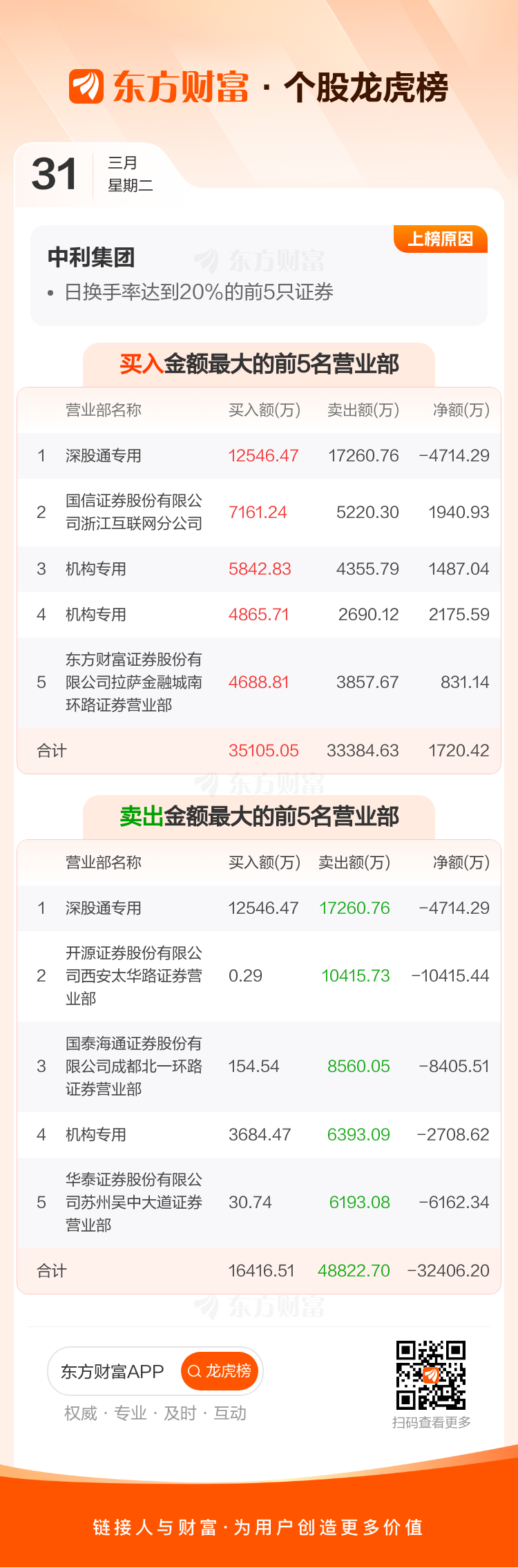 交易所2026年3月31日公布的交易公开信息显示,中利集团因成为日换手率达到20%的前5只证券上榜。中利集团当日收报4.94元,涨跌幅3.78%,偏离值41.87%,换手率41.87%,成交额49.03亿。