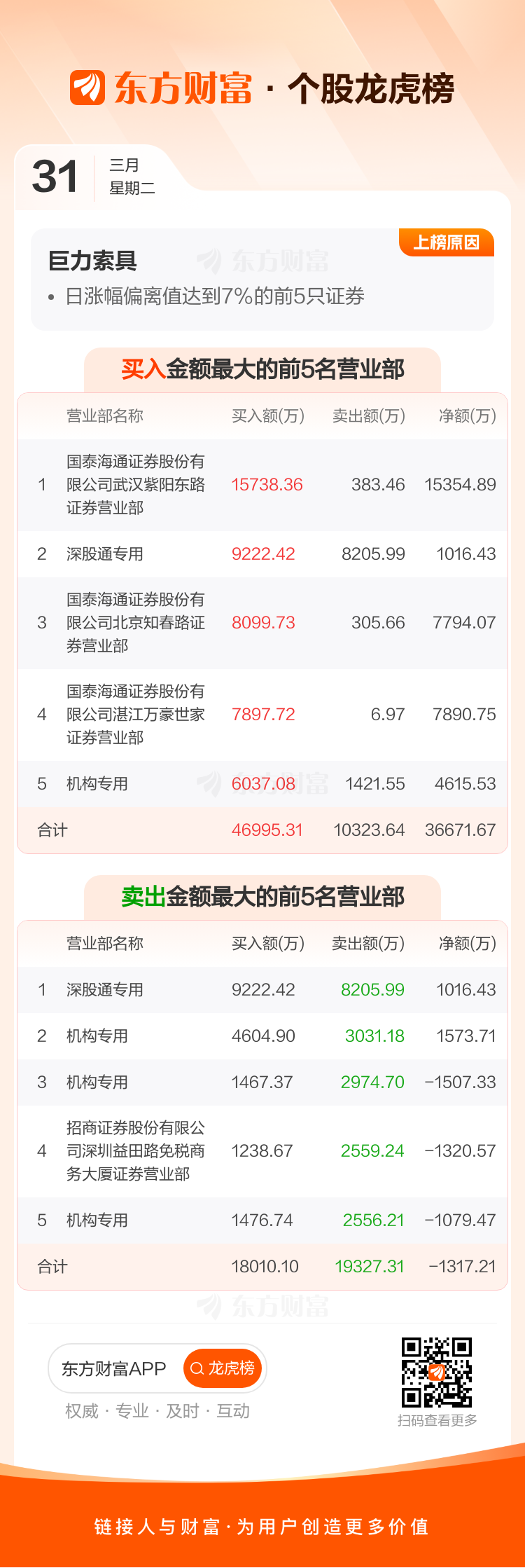 巨力索具(002342)龙虎榜数据(03-31)