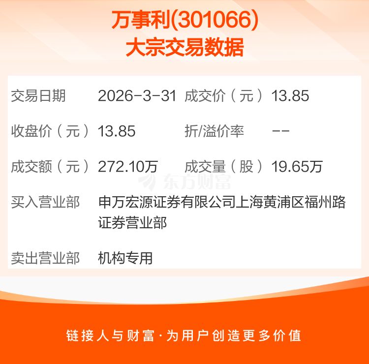 2026年3月31日,万事利发生1笔大宗交易,共成交19.65万股,成交金额272.10万元,占其流通市值比例为0.08%。