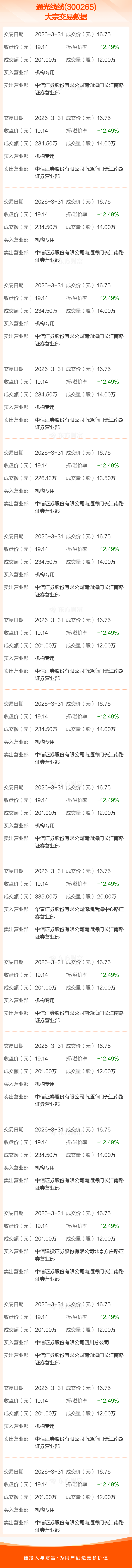 大宗交易:通光线缆成交4011.63万元,折价12.49%(3-31)