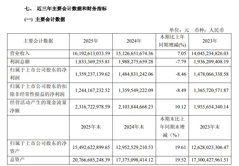 然而,在营收增长的背后,盈利端却亮起了红灯。财报数据显示,归属于上市公司股东的净利润为13.59亿元,较去年同期的14.85亿元下滑8.46% 。扣除非经常性损益后的净利润为12.44亿元,同比下滑8.49%。