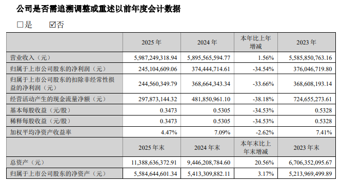 财务数据显示,2025年,莱宝高科实现营业总收入59.87亿元,同比增长1.56%;归母净利润2.45亿元,同比下降34.54%;扣非净利润2.45亿元,同比下降33.66%;经营活动产生的现金流量净额为2.98亿元,同比下降38.18%。
