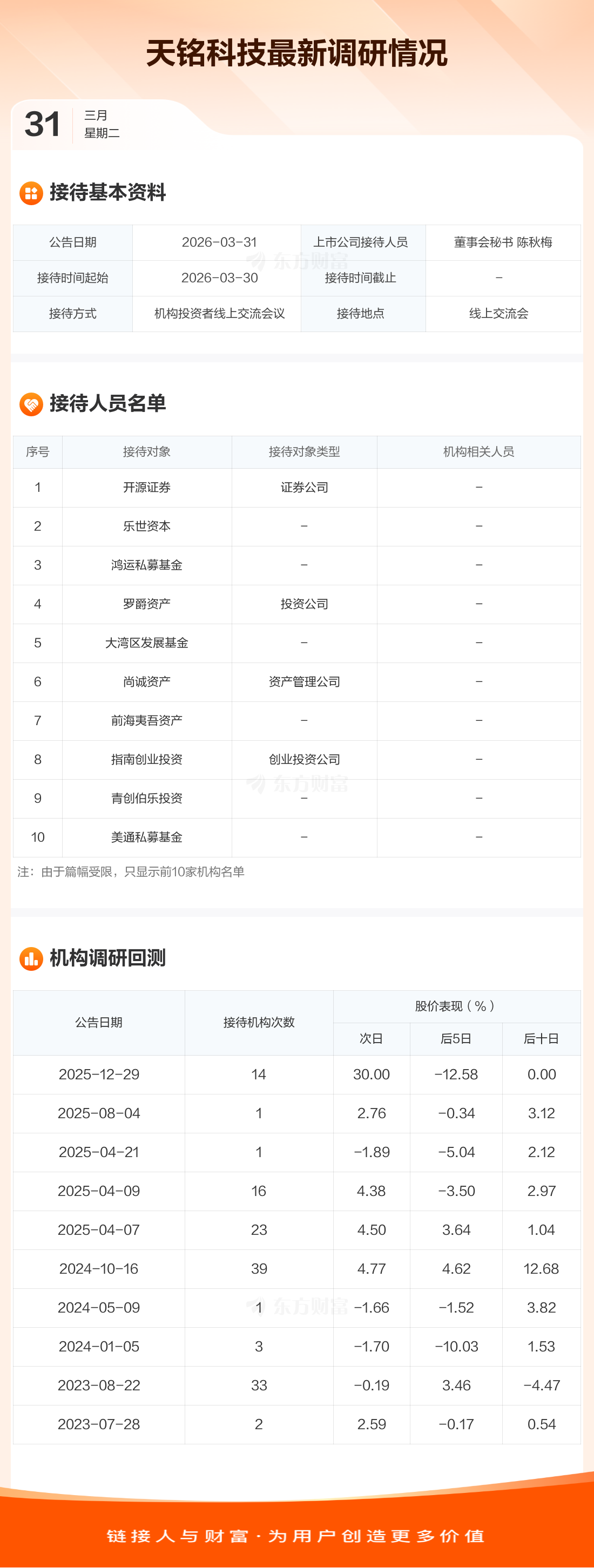 天铭科技3月31日公告称,3月30日接待开源证券等20家机构调研。接待人员包括董事会秘书 陈秋梅。