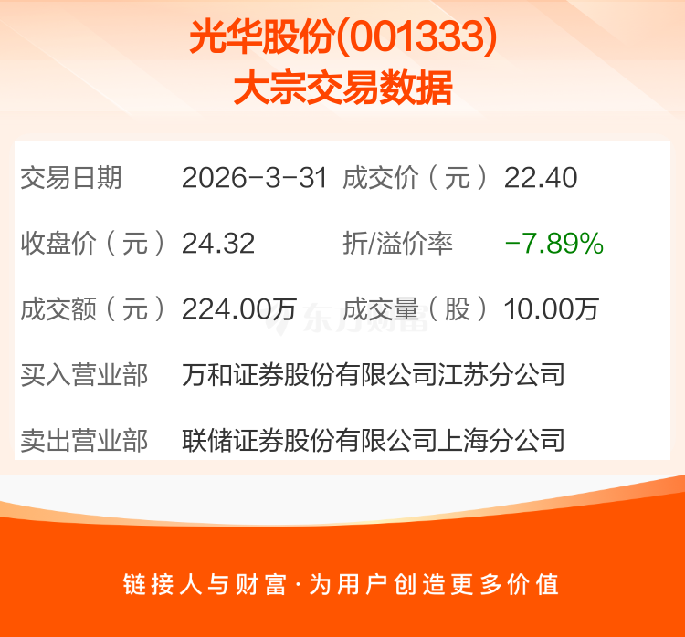 2026年3月31日,光华股份发生1笔大宗交易,共成交10.00万股,成交金额224.00万元,占其流通市值比例为0.21%。
