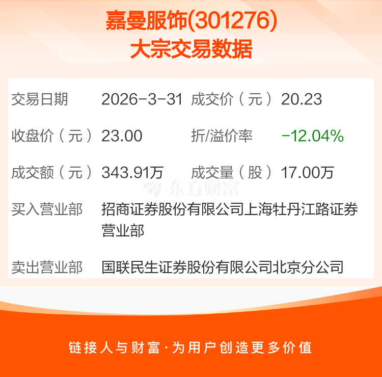 2026年3月31日,嘉曼服饰发生1笔大宗交易,共成交17.00万股,成交金额343.91万元,占其流通市值比例为0.21%。