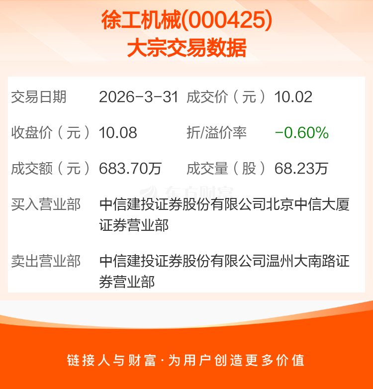 大宗交易:徐工机械成交683.70万元,折价0.60%(3-31)