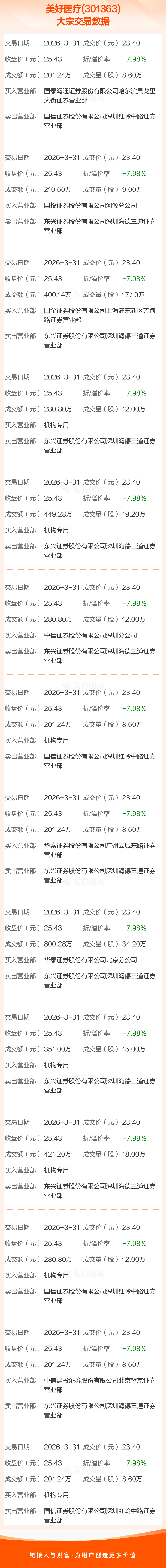 大宗交易:美好医疗成交4481.10万元,折价7.98%(3-31)