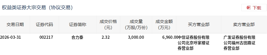 合力泰今日大宗交易折价成交3000万股,成交额6960万元