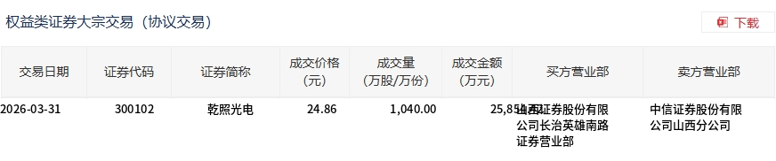 乾照光电今日大宗交易折价成交1040万股,成交额2.59亿元
