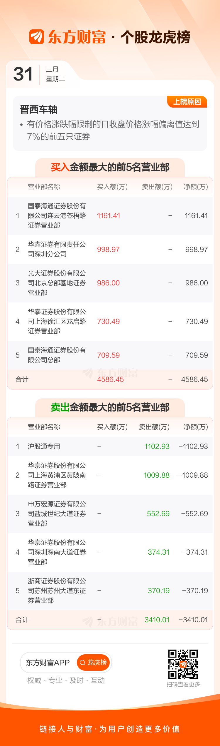交易所2026年3月31日公布的交易公开信息显示,晋西车轴因成为有价格涨跌幅限制的日收盘价格涨幅偏离值达到7%的前五只证券上榜。晋西车轴当日收报4.93元,涨跌幅10.04%,偏离值10.85%,换手率5.95%,成交额3.47亿。