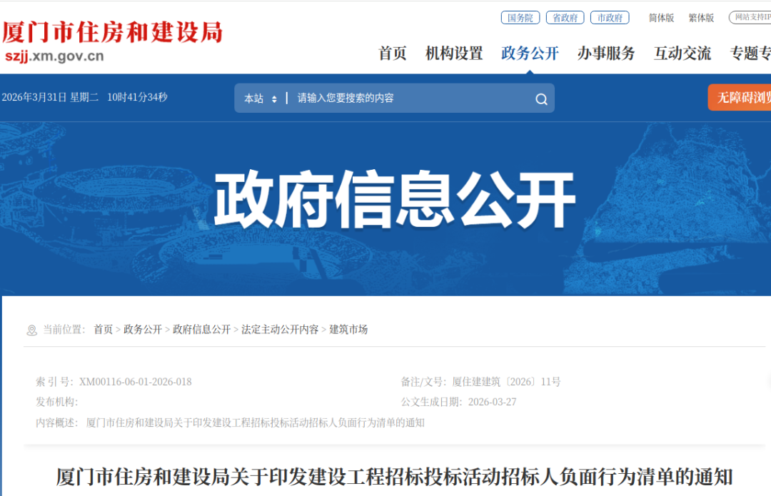 为进一步规范我市建设工程招标投标活动,强化对招标人的行为约束,推动招投标市场健康有序、公开透明运行,依据《中华人民共和国招标投标法》《中华人民共和国招标投标法实施条例》等相关法律法规及政策文件,结合我市有关制度规定,我局汇总形成了《厦门市建设工程招标人负面行为清单》,现印发给你们,请认真对照落实。