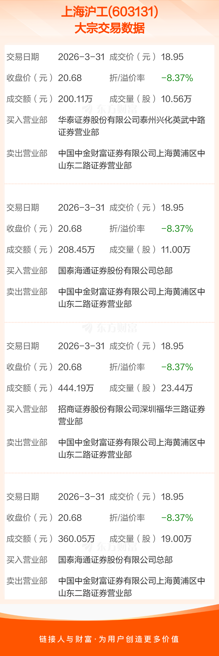 2026年3月31日,上海沪工发生4笔大宗交易,共成交64.00万股,成交金额1212.80万元,占其流通市值比例为0.17%。