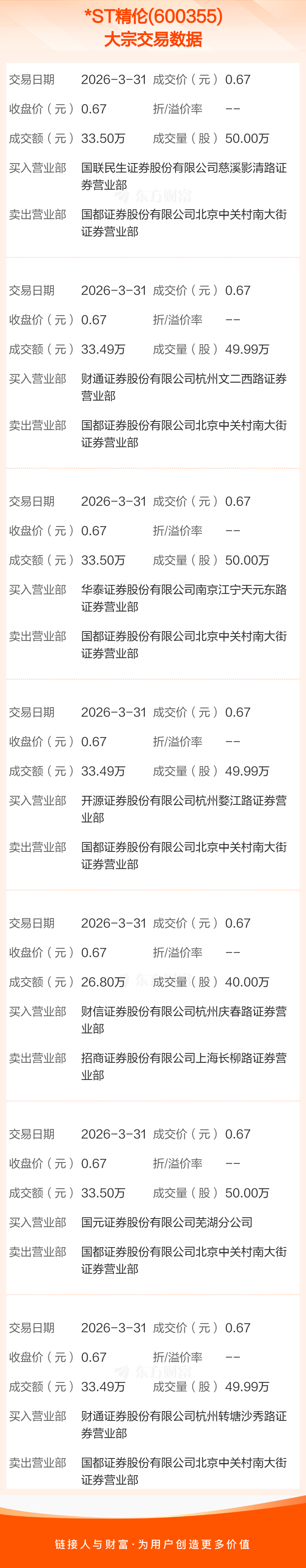 2026年3月31日,*ST精伦发生7笔大宗交易,共成交339.97万股,成交金额227.77万元,占其流通市值比例为0.69%。