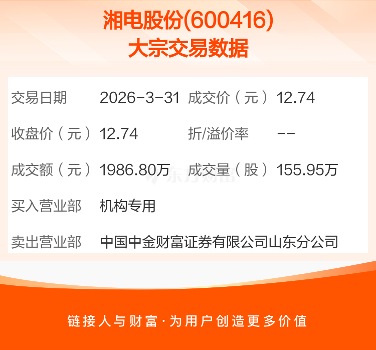 2026年3月31日,湘电股份发生1笔大宗交易,共成交155.95万股,成交金额1986.80万元,占其流通市值比例为0.11%。
