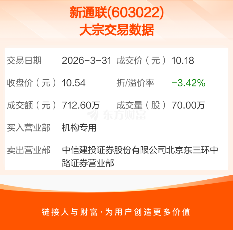 2026年3月31日,新通联发生1笔大宗交易,共成交70.00万股,成交金额712.60万元,占其流通市值比例为0.34%。
