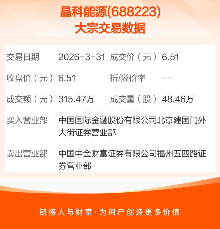 2026年3月31日,晶科能源发生1笔大宗交易,共成交48.46万股,成交金额315.47万元。