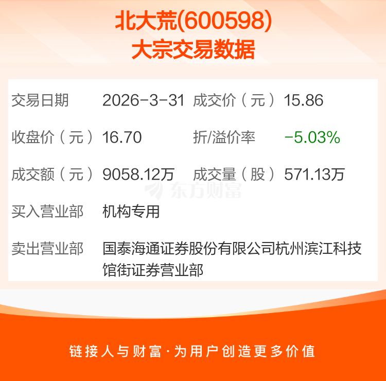 大宗交易:北大荒成交9058.12万元,折价5.03%(3-31)