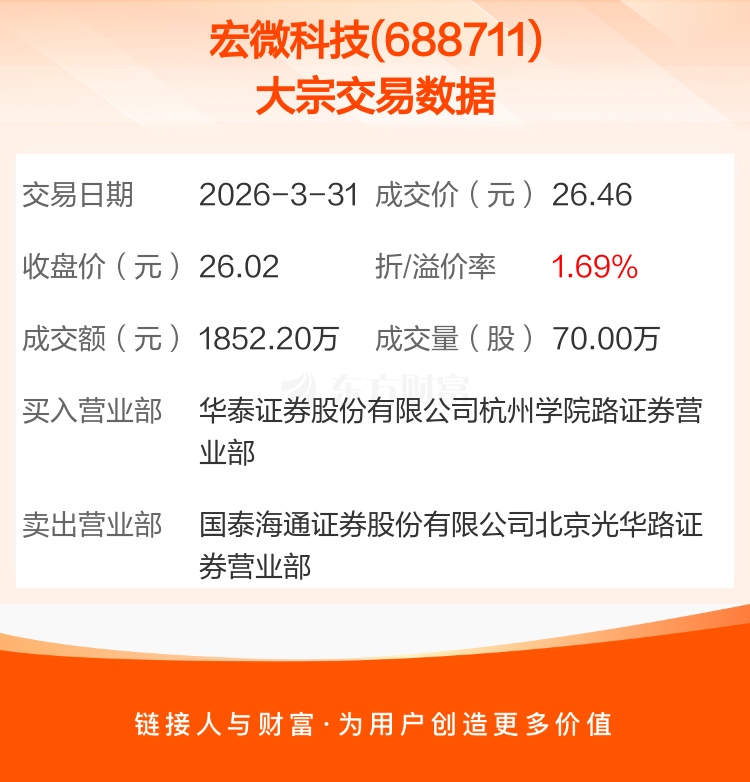 2026年3月31日,宏微科技发生1笔大宗交易,共成交70.00万股,成交金额1852.20万元,占其流通市值比例为0.33%。